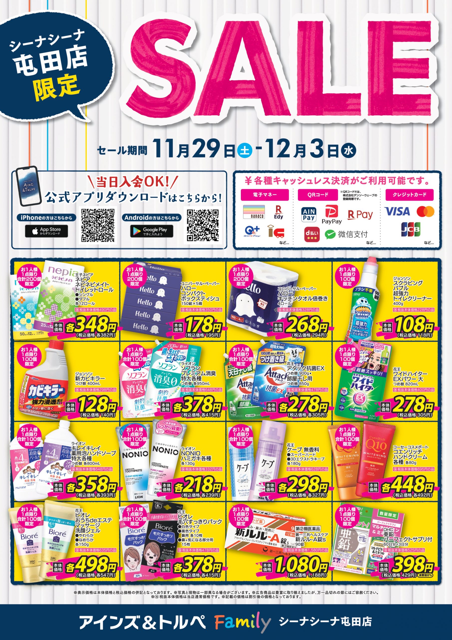 シーナシーナ屯田店 🔥限定セール🔥 期間:11/29(土)~12/3(水) ※画像はタップすると拡大できます。 シーナシーナ 屯田店限定セールのお知らせ! セール内容は上記画像をご確認ください。 皆さまのご来店をお待ちしております💛 ■対象店舗 シーナシーナ 屯田店