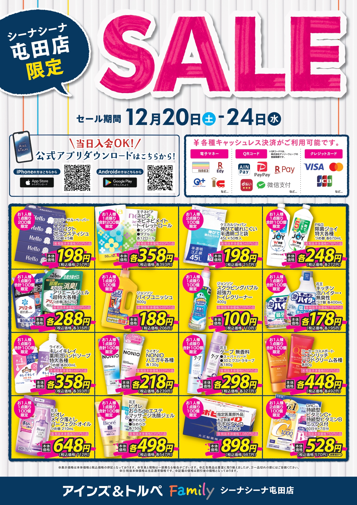 シーナシーナ屯田店 🔥限定セール🔥 ※画像はタップすると拡大できます。 期間:12/20(土)~12/24(水) シーナシーナ 屯田店限定セールのお知らせ! セール内容は上記画像をご確認ください。 皆さまのご来店をお待ちしております💛 ■対象店舗 シーナシーナ 屯田店