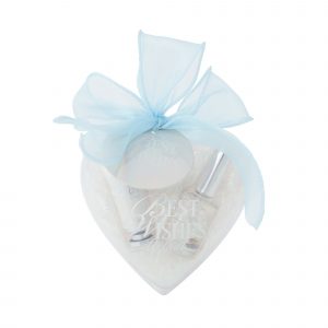 オーナメントのようなハート型クリア容器に入った、ネイルオイルとハンドクリームのハンドケアセットです。