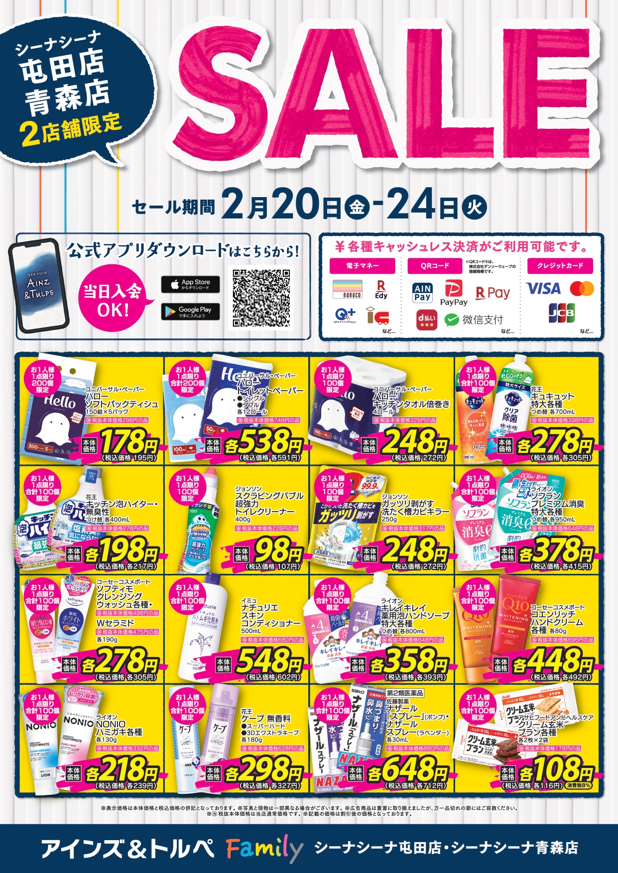 シーナシーナ屯田店 シーナシーナ青森店 \店舗限定セール/ 期間:2/20(金)~2/24(火) ※画像はタップすると拡大できます。 期間中、シーナシーナ 屯田店・青森店にてセールを開催いたします。 詳しくは画像をご確認ください。 皆さまのご来店をお待ちしております💛 ■対象店舗 シーナシーナ 屯田店・青森店